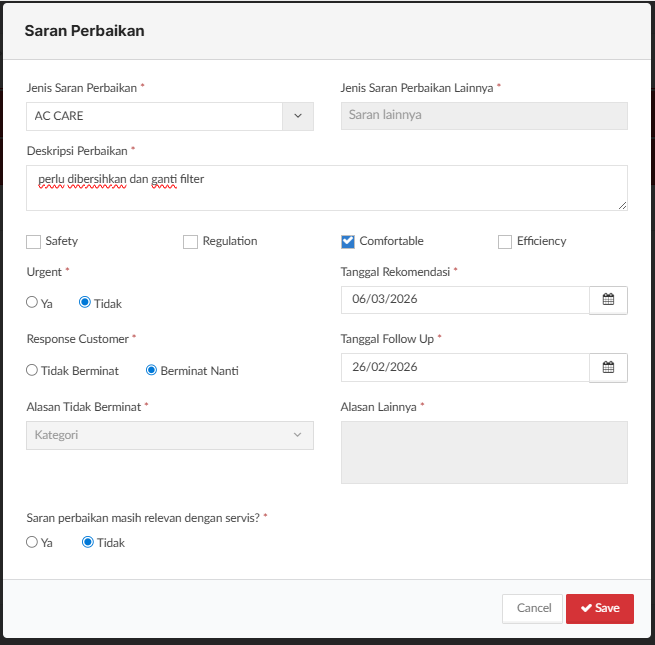 - Sedangkan kolom Suggest service selanjutnya berdasarkan customer habit (dihitung berdasarkan tanggal aktual service berkala).