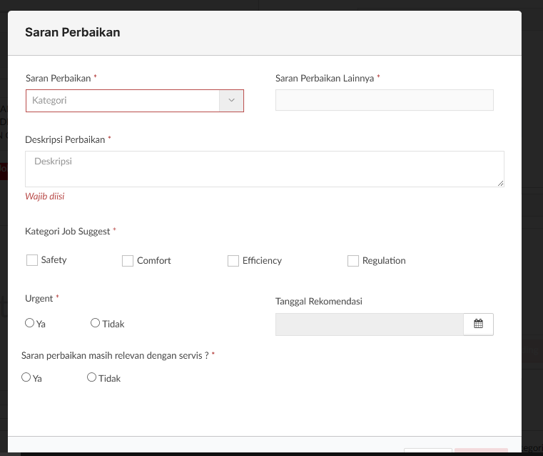 untuk menambahkan saran perbaikan klik tombol Tambah sehingga menampilkan form sebagai berikut :