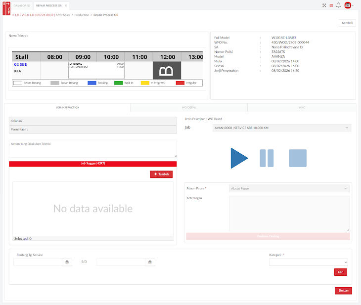 Menu ini menampilkan semua WO yang harus dikerjakan proses produksi. PTM GR atau Foreman GR dapat melakukan input nomor WO ataupun nomor Polisi untuk mencari WO yang sudah dialokasikan kepada mereka. PTM GR atau Foreman GR juga dapat memfilter berdasarkan nama. Teknisi atau Foreman dapat memulai clock on, clock off, dan pause pekerjaan dengan menekan WO chip yang berada di WO List Screen untuk menampilkan screen “Job Instruction”.
