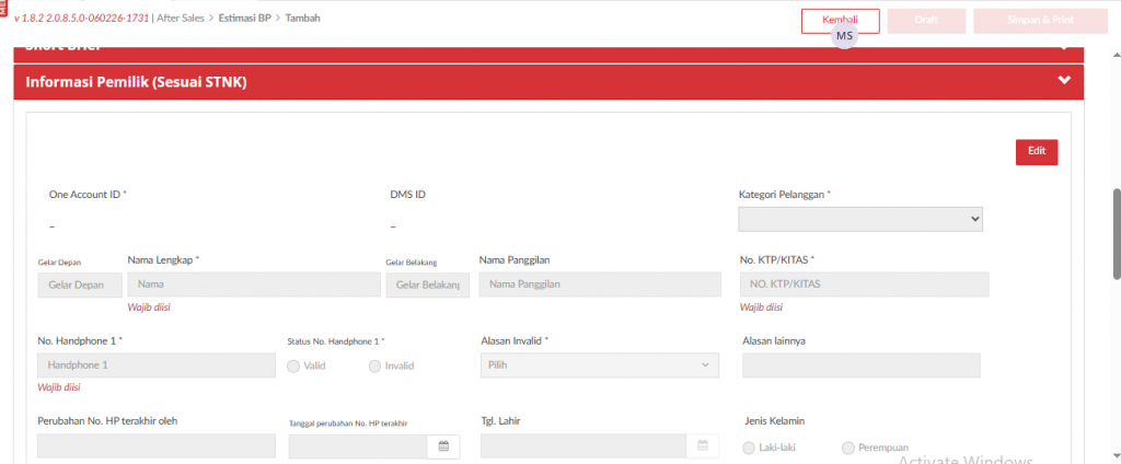 • Jika Data Pelanggan & Kendaraan tidak ada & Data Estimasi ada, sistem menampilkan Pop-Up informasi Data Pelanggan & Kendaraan di CRM: Tidak Ada, Data Estimasi: Ada.