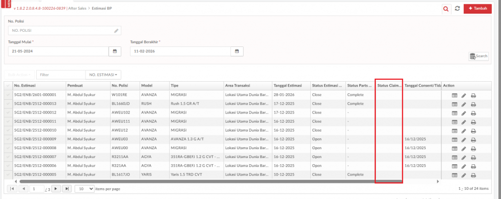 Data estimasi yang sudah dibuat akan tampil pada menu utama Estimasi BP. Kolom Status Claim akan menampilkan status pengajuan claim SPK Insurance yang dibantu oleh cabang. Status claim yang akan ditampilkan antara lain :