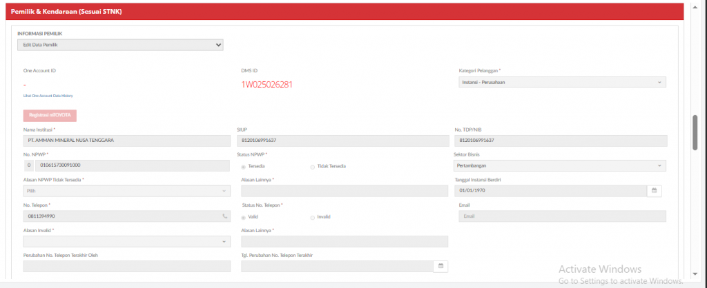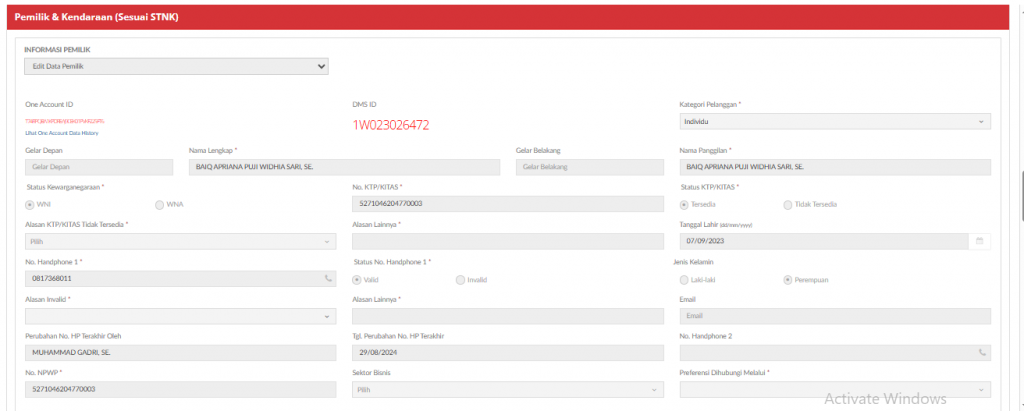 Customer Pemilik adalah Informasi pelanggan sesuai dokumen STNK. Bisa berupa individu ataupun instansi. Data Pemilik bisa diedit. Proses perubahan data pemilik hanya bisa dilakukan secara minor. Pemilik as is namun ada fields yang ingin diubah (contoh ada pergantian no. HP). Apabila secara pemilik berubah, seperti contoh dari A ke B, maka secara sistem tidak diperbolehkan. Perubahan seperti itu hanya bisa dilakukan di reception karena evidence yang didapat lebih valid.