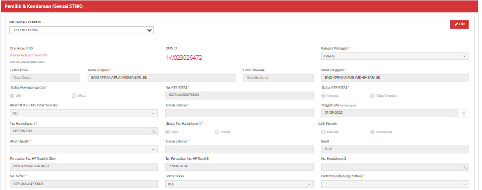 Customer Pemilik adalah Informasi pelanggan sesuai dokumen STNK. Bisa berupa individu ataupun instansi. Data Pemilik bisa diedit. Proses perubahan data pemilik hanya bisa dilakukan secara minor. Pemilik as is namun ada fields yang ingin diubah (contoh ada pergantian no. HP). Apabila secara pemilik berubah, seperti contoh dari A ke B, maka secara sistem tidak diperbolehkan. Perubahan seperti itu hanya bisa dilakukan di reception karena evidence yang didapat lebih valid.