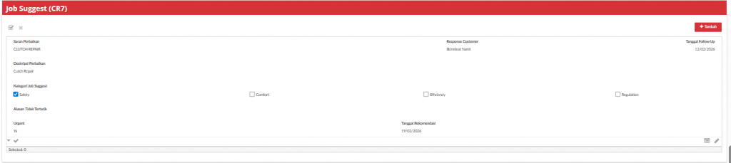 Pada tampilan Job Suggest bisa dilihat detail job yang disarankan untuk service berikutnya dari teknisi seperti berikut: